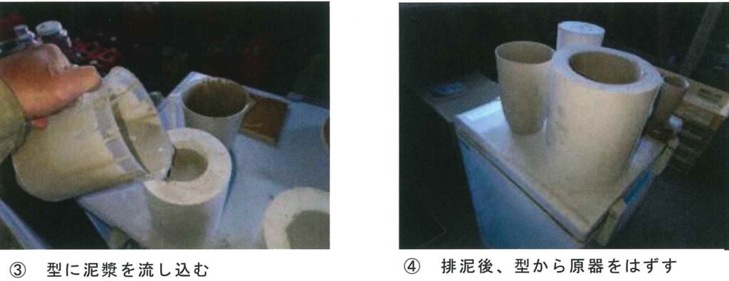 この型に泥漿というどろどろになった粘土を流し込んで(写真③)、しばらく放置し、中の粘土を排泥すると、石膏の型に水分を吸われた胎が出来上がります。(写真④)