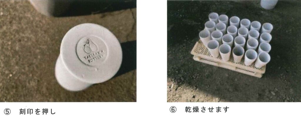 この胎は非常に歪みやすいため、乾燥するまで慎重に扱う必要がありますが、柔らかいうちに刻印を押しました。(写真⑤)