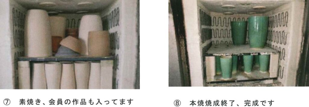 しばらく乾燥させた後(写真⑥)、素焼きを行い(写真⑦)、素焼きした作品に釉薬をかけ、本焼きすると作品の完成です。(写真⑧)